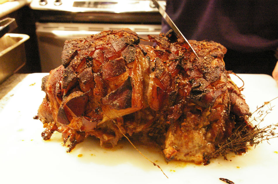 Mike took on quite the Football Sunday undertaking this week; he decided to make porchetta sandwiches. Dressed in his Sunday Dallas Cowboys uniform, he wrapped a slab of pork shoulder [that had been marinated overnight in olive oil + garlic + sage + thyme + rosemary + apple] in bacon than wrapped that in prosciutto then wrapped that in cured pork belly then cooked it in the oven for 4hrs.