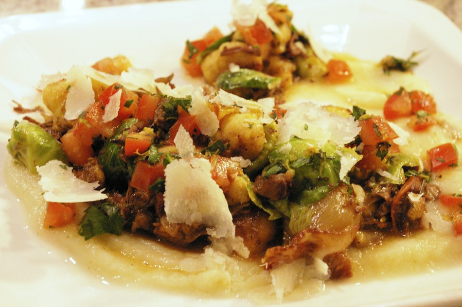 This time ’round Mike served his gnocchi with a braised beef shank mixed with caramelized garlic/onions + brussel sprouts + tomato topped with parmesan cheese and served a top a parsnip puree.