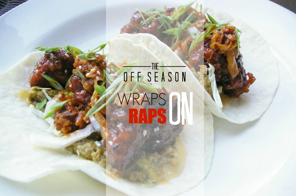 Over the years, I’ve passively + actively, watched the Raps during the Carter reign, the Bosh period, the Bargnani block, the purple logo, the red logo, and now the UPRISING of the young guns [+Drake and his Lint Roller]. Today was game 4 in the Raptors vs Nets series in Brooklyn and since Kial missed out on the Japanese soul food last week, we had a Raptors re-do this week. In this Raptors Game 4 Playoff edition of The Off Season, Mike + Kial made ramen along with the ultimate east meets west dish – karaage tacos!