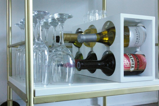 [7] wine -my 2nd addition was a wine rack | I went with a more modular shaped rack to double as an extra glassware surface; perfect for my shot glasses!