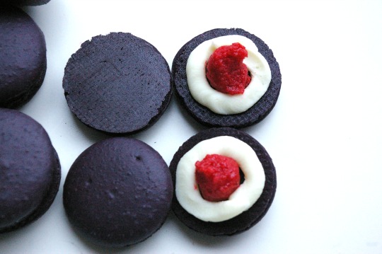 once macarons have been paired, pipe a ring of white chocolate ganache on 1/2 of each cookie