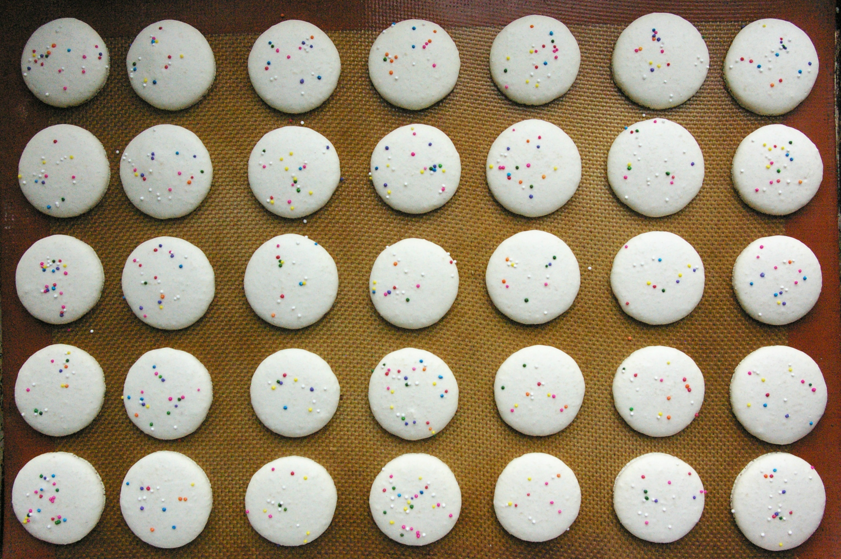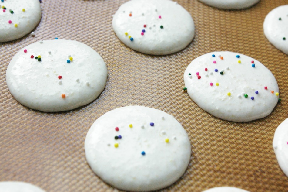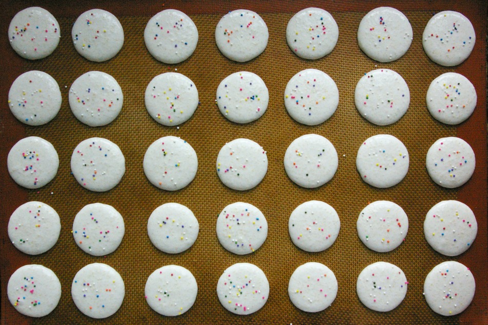 **once the shells have been piped sprinkle the sprinkles on each cookie before leaving them to dry on the baking sheets