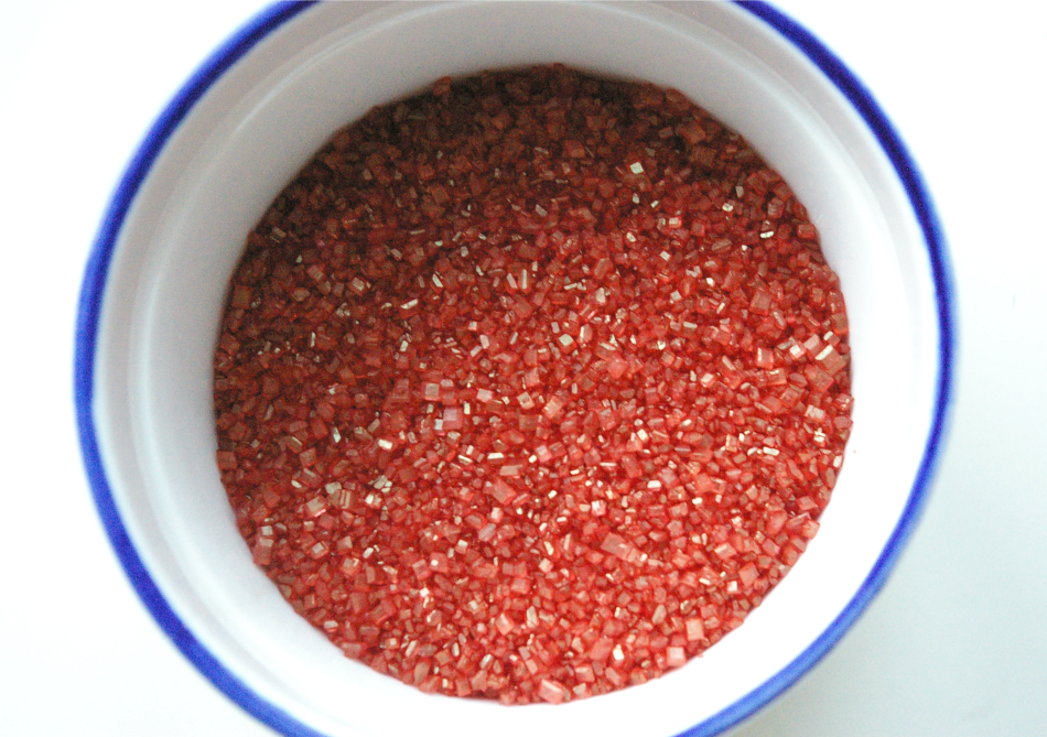• immediately pour the red sugar onto the chocolate and shake off the extra granules