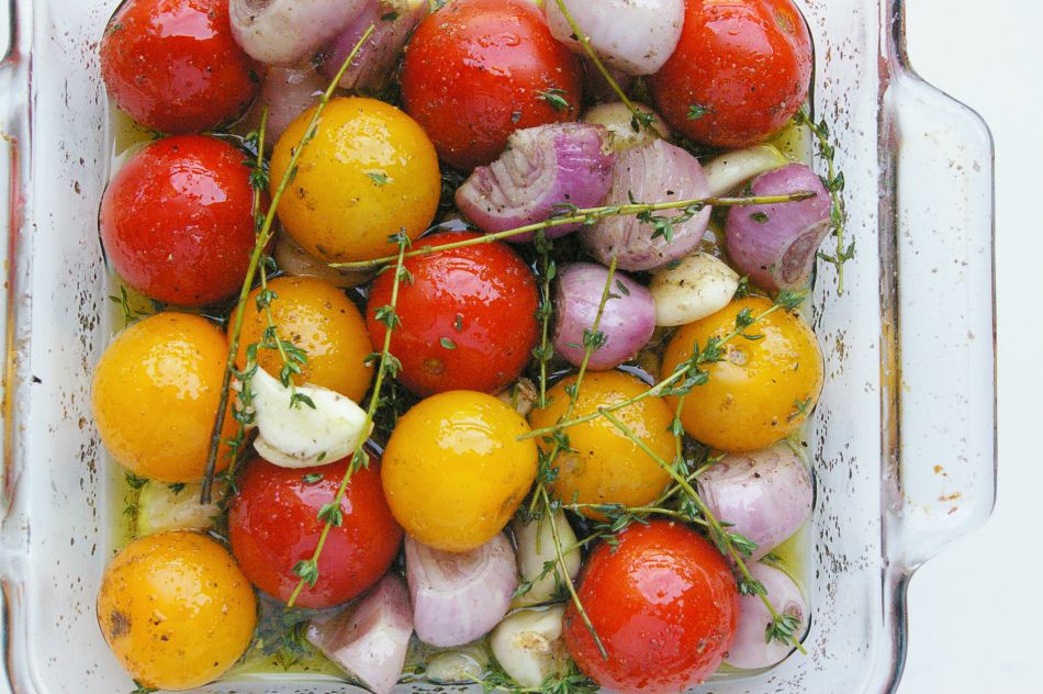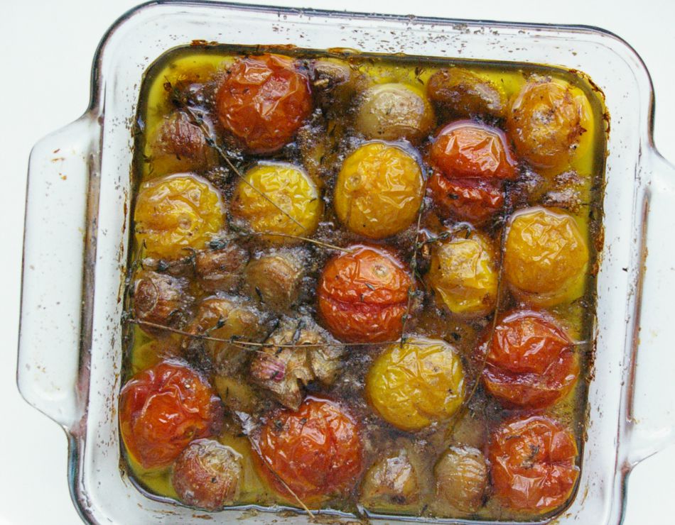 in a pan add the roasting liquid + sauté the garlic, onion, and tomatoes until onions become translucent