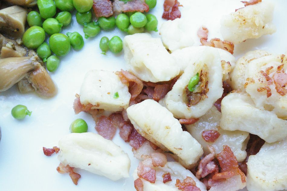 once boiled, sauté in a pan with bacon until sides begin to brown