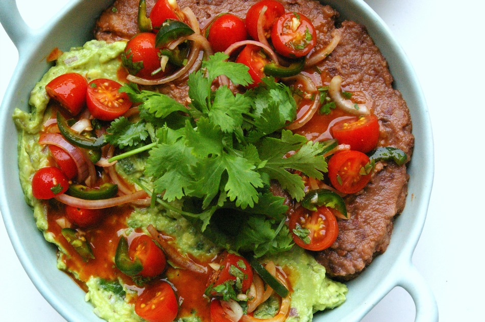 in a medium-large sized serving bowl, with a spatula, pour the bean dip into 1 side of the bowl and the guacamole into the other